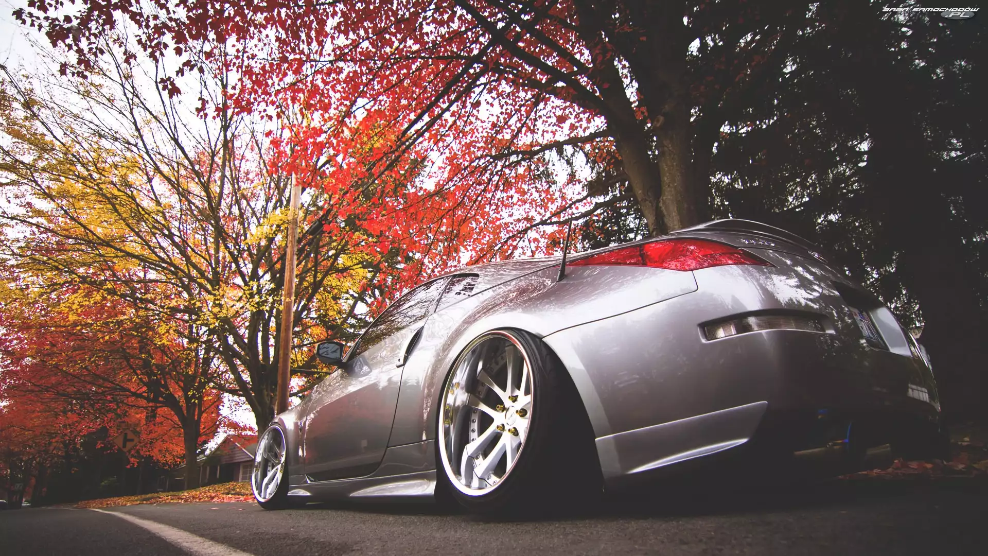 Samochód: Drzewa, Nissan, Srebrny, Jesień, Droga, Samochód, 350Z
